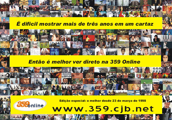 Design dos anos 90? Gifs escandalosos que dão tontura em apenas um segundo? Sim! Em cada edição, a 359 Online experimentou novos conceitos e formas, e esta é a graça de se construir a internet. Tudo é possível. Aqui, trazemos imagens, layouts, logos e cartazes para relembrar a história desta revista digital. Navegue e divirta-se!
